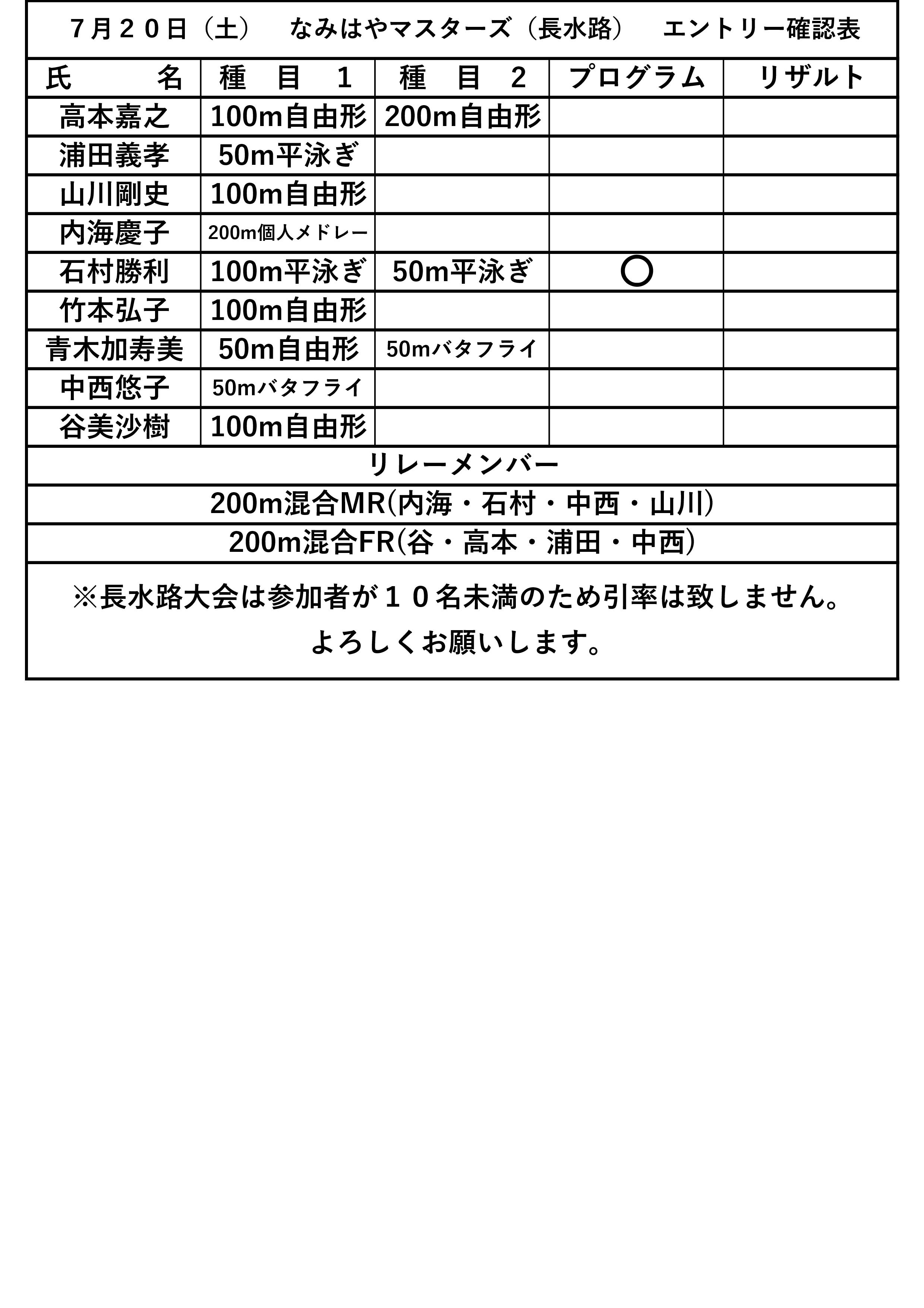 7月20・21日に開催されるなみはやマスターズのエントリー確認になります。